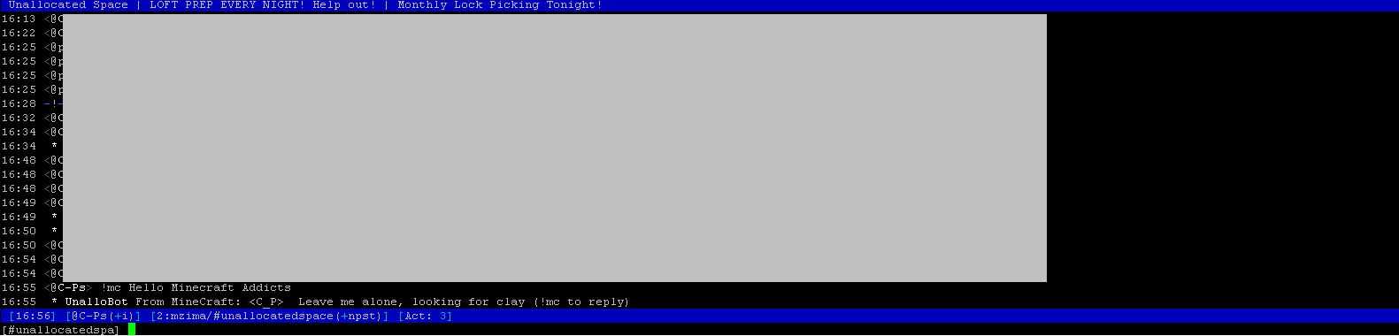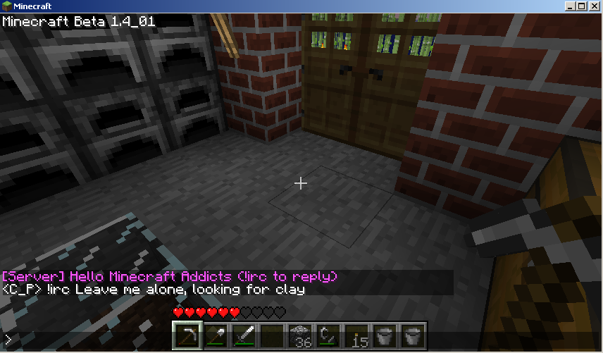 Talking to people inside the Minecraft server through IRC is done using the !mc command on the IRC Bot. Inside Minecraft chat using !irc will send messages to the IRC channel through the bot.